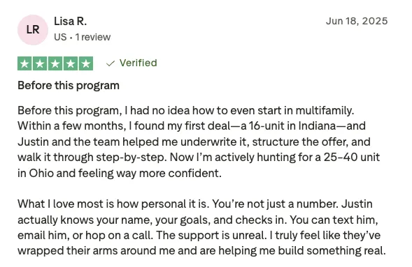 "The 3 day workshop is a great way to start. I loved learning from Justin. He is very good at explaining the step by step process to own an apartment building. I have owed single family rentals, but never bought an apartment. This challenge and program were a great start."